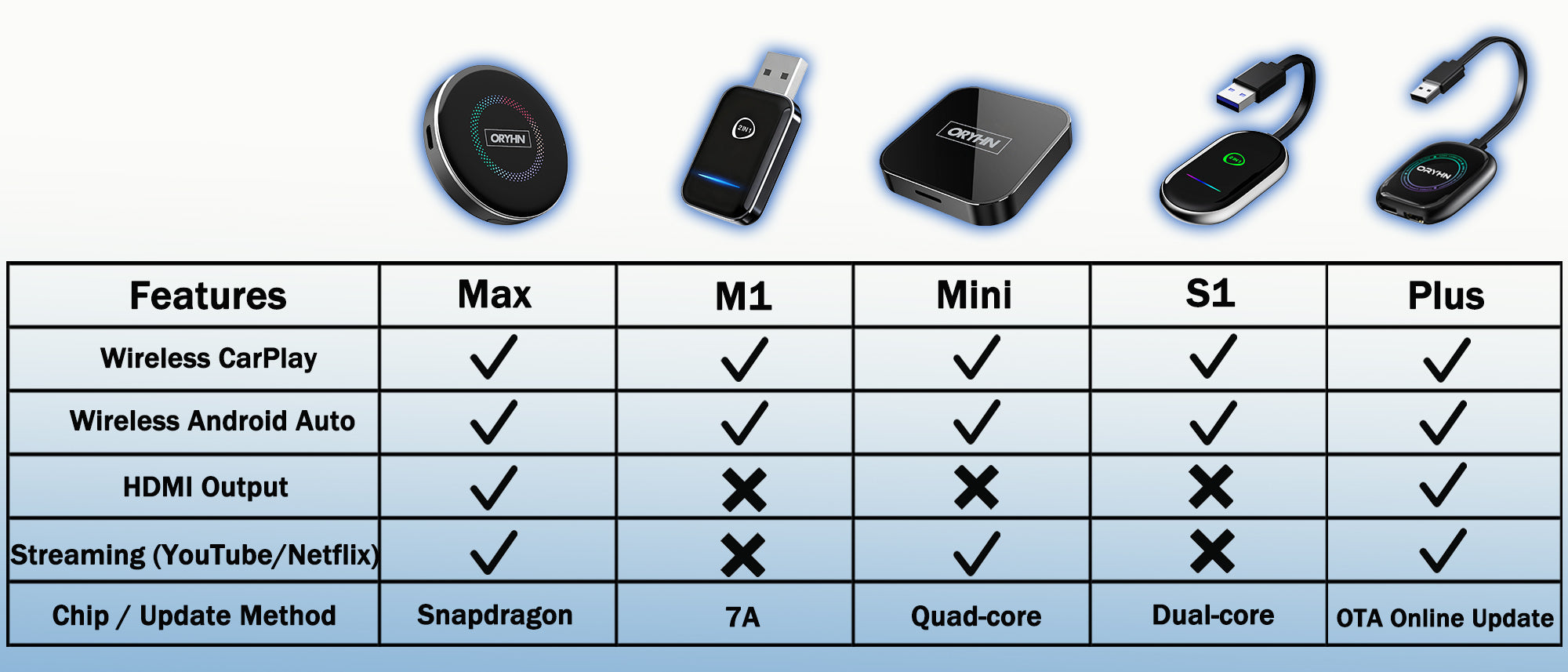 Oryhn devices (especially the M1 and AI Box Max) feature high-performance chips and 5.8GHz Wi-Fi, offering smooth, low-latency wireless CarPlay/Android Auto.