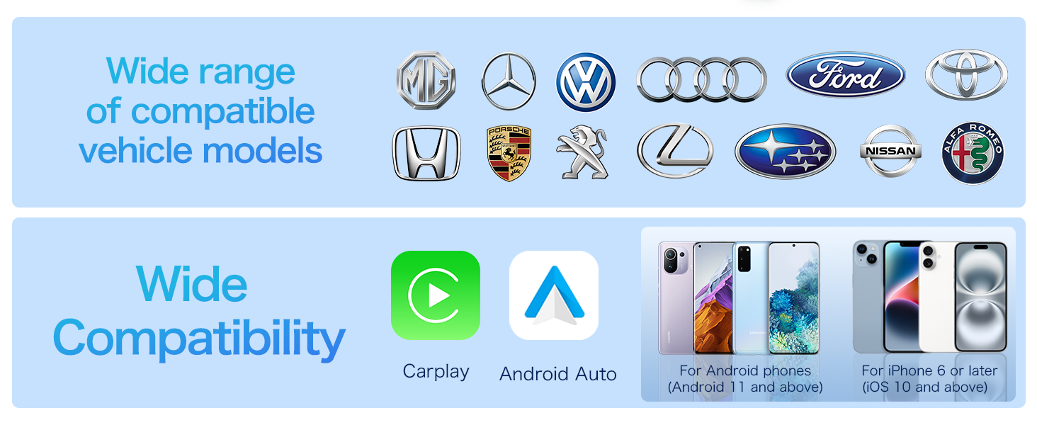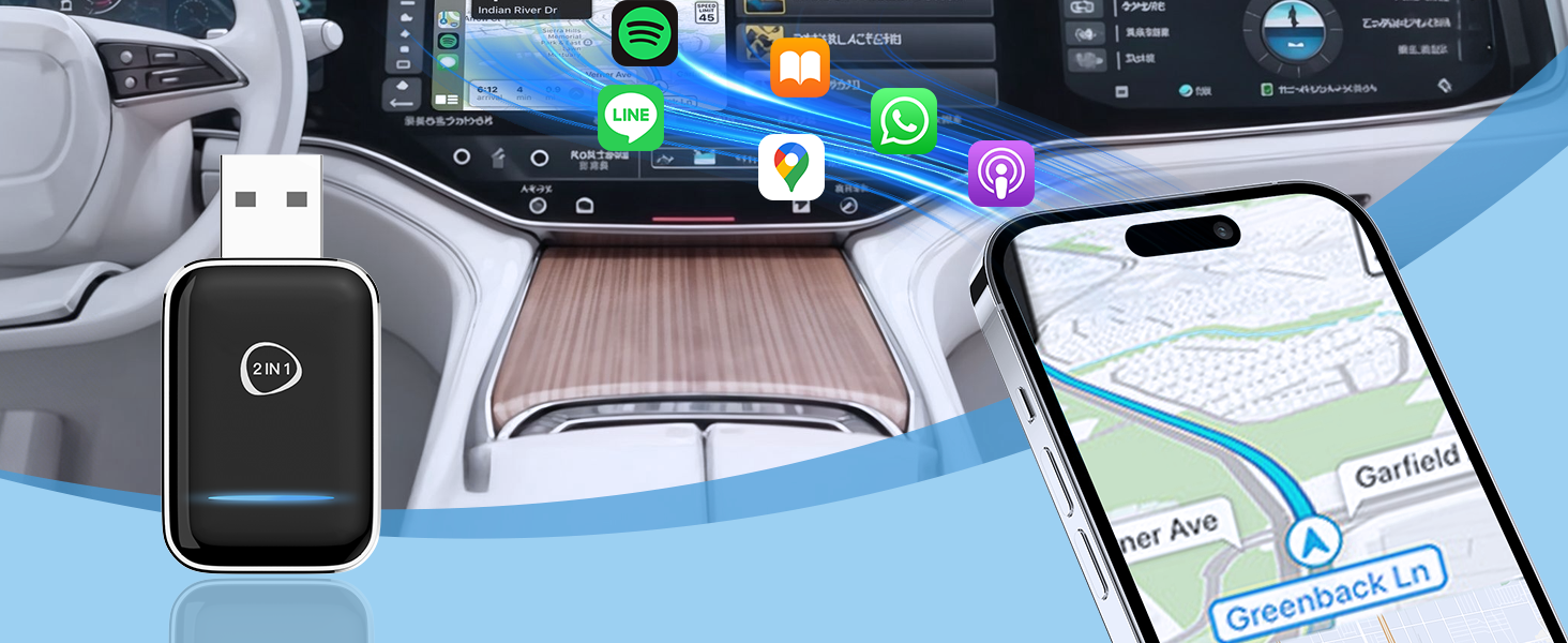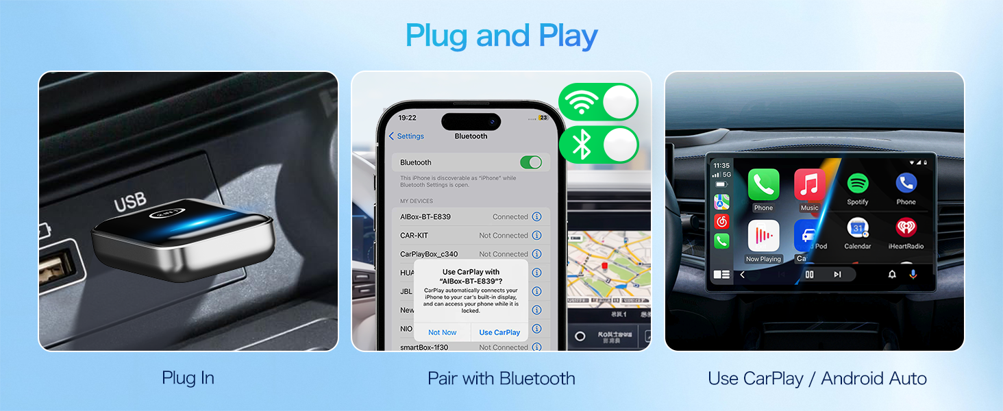 Getting started is easy: just plug in the adapter, tap “Auto/CarPlay” on your screen, enable Bluetooth and WiFi on your phone, and connect to “AutoBox-XXXX.” Enjoy a wireless experience in under a minute.