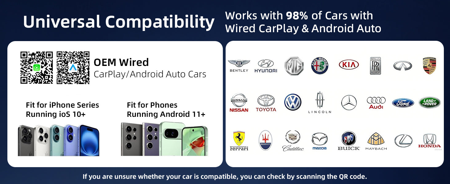 Oryhn AI Box Lite is compatible only with vehicles equipped with OEM wired CarPlay or both wired and wireless CarPlay. It does not support vehicles with OEM wireless-only CarPlay, such as certain BMW or Tesla models.